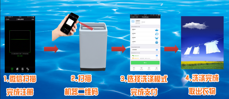 互聯(lián)網(wǎng)O2O自助洗衣機,即用戶通過手機客戶端來了解洗衣房的運轉(zhuǎn)狀態(tài),可以提前預(yù)約洗衣操作。通過掃碼連接相應(yīng)的洗衣機,可以自由選擇洗衣模式,實時查詢洗衣進(jìn)度,通過手機接收實時提醒,用戶可以通過客戶端來在線完成支付。