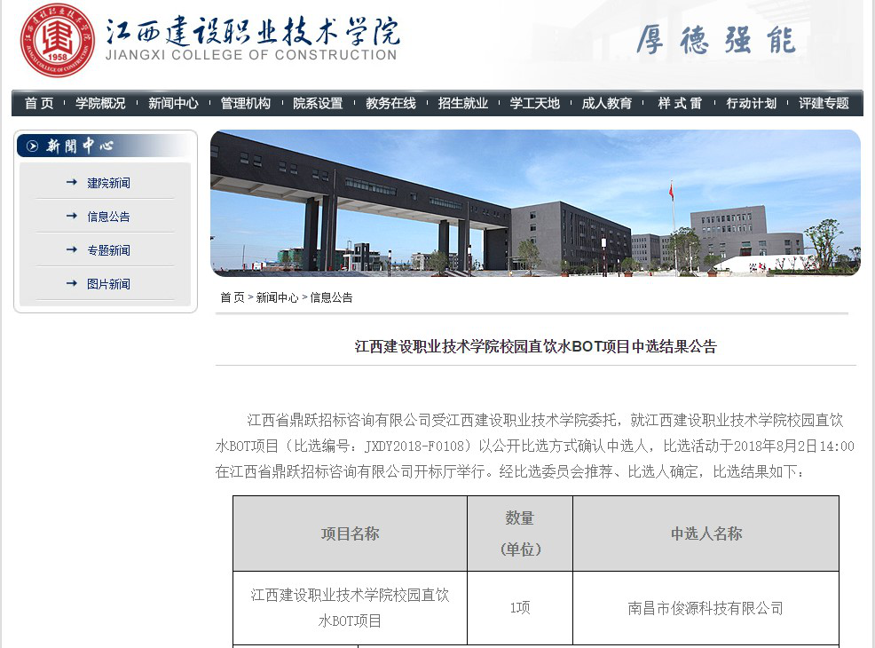 近日,由江西省鼎躍招標咨詢有限公司受江西建設(shè)職業(yè)技術(shù)學院委托組織公開比選,江西建設(shè)職業(yè)技術(shù)學院校園直飲水BOT項目,南昌俊源科技有限公司憑借過硬的產(chǎn)品質(zhì)量、豐富的校園直飲水工程項目經(jīng)驗和完善的售后服務體系,贏得評委的一致認可,在眾多品牌中脫穎而出,中標成功!